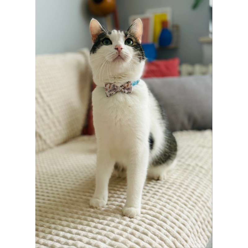 - Ozdobna niebieska muszka – elegancki, klasyczny akcent podkreślający styl kota